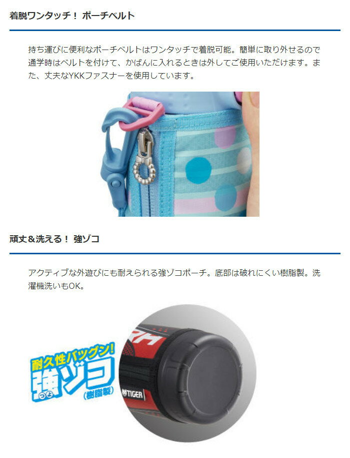 商品仕様:■メーカー:タイガー■JANコード:4904710425954■商品名:水筒 ステンレス ボトル 直飲み コップ 2WAY 1リットル 1000ml 1L 保温・保冷OK ワンプッシュ ポーチ付き 丸洗いOK 遠足 運動会■型番:MBO-H100■カラーバリエーション:ブラックドット【4904710425954/MBO-H100(KT)】、ブラック【4904710425961/MBO-H100(K)】■実容量:中せんユニット:1.0L、キャップユニット:1.05L■保温効力(6時間):中せんユニット:79度以上※保温効力とは、室温20度±2度において製品に熱湯を満たし、縦置きにした状態で湯温が95度±1度のときから1時間および6時間放置した場合におけるその湯の温度です。